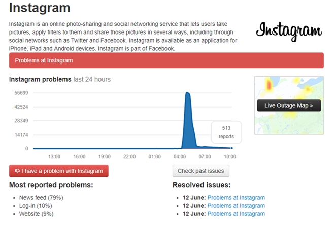 Rạng sáng ngày 14-6, thông qua chuyên trang báo lỗi Downdetector, người dùng tại nhiều khu vực trên thế giới cho biết, họ gặp khó khăn khi truy cập mạng xã hội Instagram.