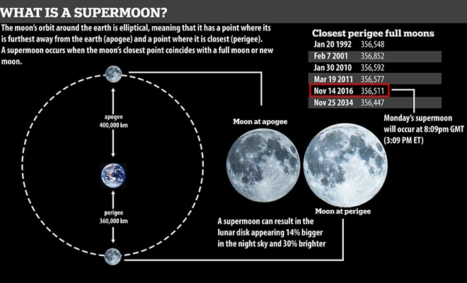 | Đồ họa cho thấy siêu trăng xuất hiện với kích cỡ và ánh sáng lớn hơn 10% so với bình thường. |