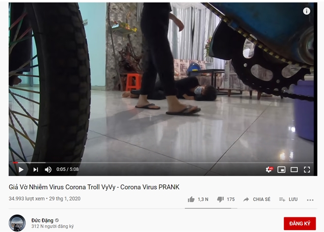 Cụ thể, đoạn video được đăng tải ngày 29-1 vừa qua trên tài khoản Youtube có tên Đức Đặng với tiêu đề "Giả Vờ Nhiễm Virus Corona Troll VyVy - Corona Virus PRANK".