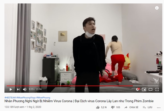 Cũng với nội dung tương tự, tài khoản Youtube Nhân Phương Vlog hôm 1-2 cũng đăng tải một đoạn video có tiêu đề "Nhân Phương Nghi Ngờ Bị Nhiễm Virus Corona | Đại Dịch virus Corona Lây Lan như Trong Phim Zombie" nhằm bày trò trêu đùa người thân trong gia đình rằng mình bị nhiễm virus Corona. Điều đáng nói, Youtuber này lôi vợ con mình ra làm trò đùa khiến nhiều người xem phẫn nộ.