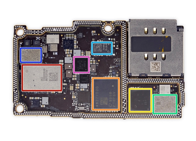 | Một phần kinh kiện khác được đánh dấu theo màu gồm có màu đỏ: SoC Apple/USI 339S00648 WiFi/Bluetooth. Màu cam: modem Intel X927YD2Q. Màu vàng: bộ thu phát Intel 5765 P10 A15 08B13 H1925. Màu xanh lá: Skyworks 78223-17 PAM. Màu xanh ngọc: 81013 - Qorvo Envelope Tracking. Màu xanh dương: Skyworks 13797-19 DRx. Màu tím: Intel 6840 P10 409 H1924 baseband PMIC |