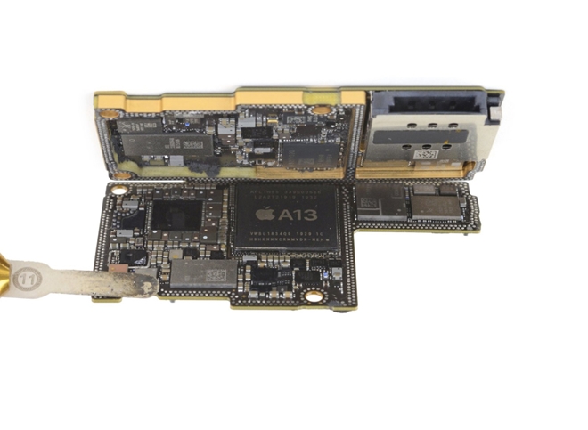 | Danh sách cụ thể theo màu gồm: màu đỏ: SoC Apple APL1W85 A13 Bionic, lấp phía trên bộ nhớ RAM SK Hynix H9HKNNNCRMMVDR-NEH LPDDR4X (dung lượng hình như có vẻ là 4GB). Màu cam: Apple APL1092 343S00355 PMIC. Màu vàng: bộ giải mã âm thanh Cirrus Logic 338S00509. Màu xanh lá: có vẻ như là con chip băng thông rộng U1. Màu xanh ngọc: Avago 8100 Mid/High band PAMiD. Màu xanh dương: Skyworks 78221-17 low-band PAMiD. Màu tím: IC quản lý năng lượng STMicrolectronics STB601A0N. |