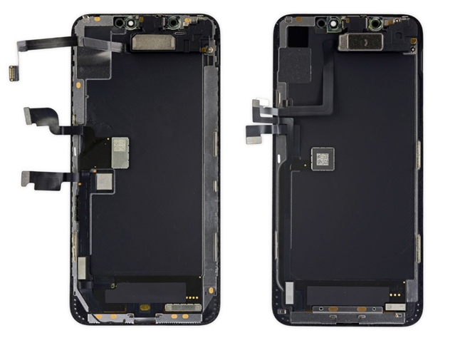 | Nếu chỉ nhìn sơ qua, màn hình của iPhone Xs Max và iPhone 11 Pro Max gần như giông nhau, không có quá nhiều sự khác biệt. Tuy nhiên về thực tế, trên iPhone 11 Pro Max do lớp 3D Touch đã bị loại bỏ, thế nên, màn hình của máy mỏng hơn khoảng 0,25mm so với người đàn anh của mình. Vì lý do này, cùng với việc tăng độ dày tổng thể của iPhone đã giúp cho Apple tăng mức dung lượng pin lên. Có một con chip nằm dưới lớp bảo vệ, đó là S2D0S23 G1927K3Q 608HVG. |