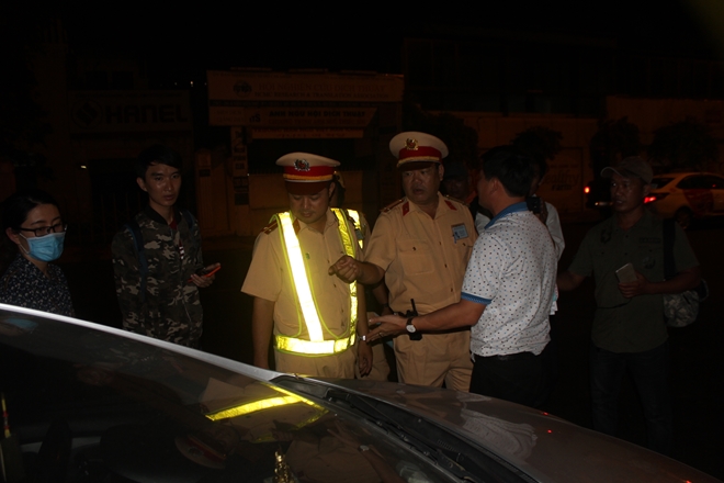Có mặt tại đây, khoảng 22 giờ, PV Báo CAND ghi nhận hàng loạt phương tiện ôtô khi lưu thông trên đường bị kiểm tra nồng độ cồn một cách ngẫu nhiên. Sau khi kiểm tra định tính, CSGT phát hiện khoảng 4 tài xế ôtô (trong tổng số gần 30 trường hợp bị kiểm tra) nghi vấn có cồn trong người. Lập tức tổ công tác tiến hành kiểm tra định lượng bằng cách cho tài xế thổi trực tiếp vào máy.