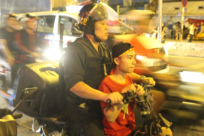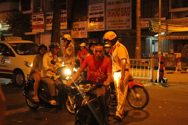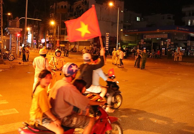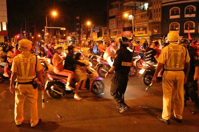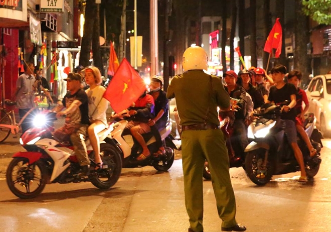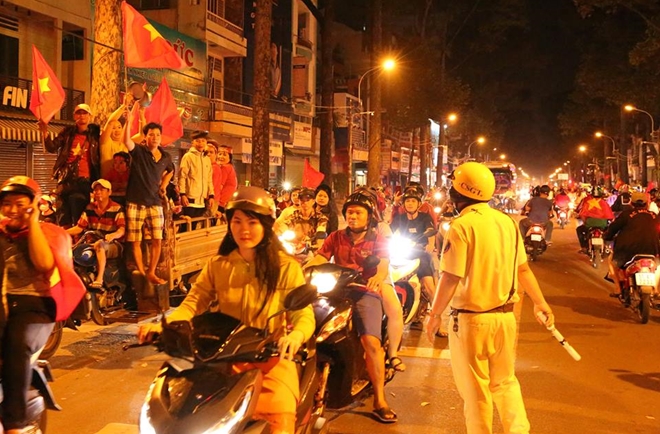 Tại nhiều tuyến đường trung tâm thành phố, dòng phương tiện đổ về mỗi lúc một đông nên một số tuyến đường bị ùn tắt cục bộ. Lực lượng CSGT đã huy động toàn bộ lực lượng túc trực tại các điểm nóng, nút giao thông trung tâm thành phố, tiến hành phân luồng điều tiết, hướng dẫn người dân tham gia lưu thông tránh ùn ứ, đồng thời, tạo không khí vui chơi, ủng hộ của người dân cho chiến thắng của đội tuyển Việt Nam.