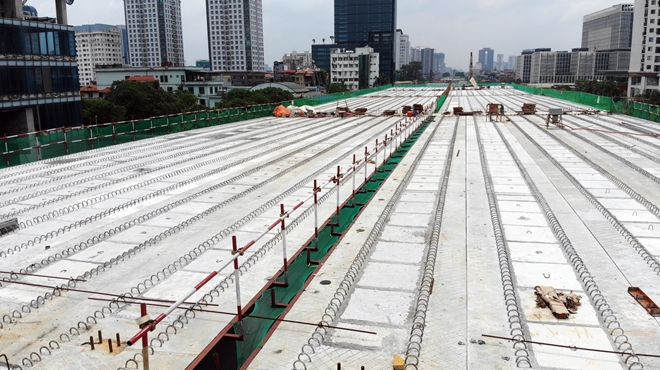 Sau hơn 1 năm thi công, toàn tuyến của Đại công trường đã xây lắp được 237 trong tổng số 1.131 phiến dầm loại gần 100 tấn; ngoài ra 437 phiến dầm được đúc sẵn để chuẩn bị lao lắp. Ngoài ra, dự án có 113 trụ cầu cạn, đến nay đã hoàn thiện 74 trụ; các đoạn chưa thi công trụ do nhà thầu chậm được bàn giao mặt bằng (đoạn giáp cầu Thăng Long và cầu Mai Dịch).