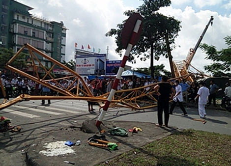 Tại hiện trường, cần cẩu vắt ngang đường Lê Hồng Phong, đè lên hàng rào công trường và cột đèn tín hiệu giao thông, rồi gãy làm nhiều đoạn. Xe đạp, xe máy của nạn nhân nằm ngổn ngang.