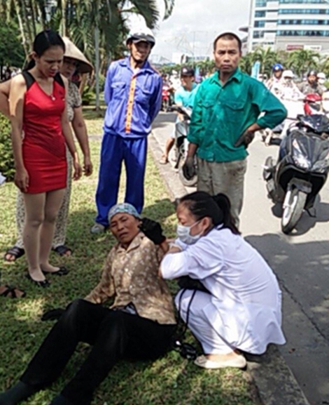 | Người đi xe đạp bị thương, đang được nhân viên y tế sơ cứu trước khi chuyển đến bệnh viện. Ảnh: Giang Chinh. |