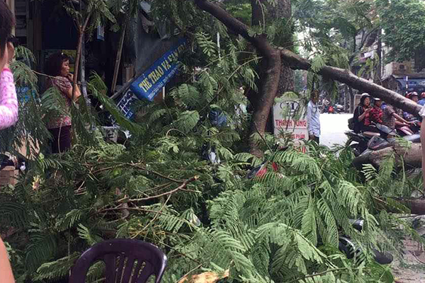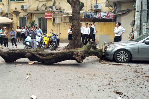 Cành phượng già khá lớn bất ngờ gãy rụng xuống đường, đè đầu một xe ô tô cùng nhiều xe máy trên phố Phan Huy Chú khiến người dân được phen hoảng sợ.