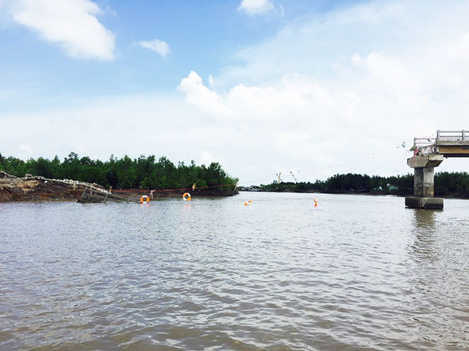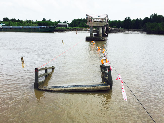 | Ngành chức năng treo phao cảnh báo đoạn cầu sập. |