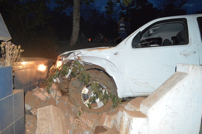 | Sau cú tông, chiếc ô tô lao vào đâm vỡ hai ngôi mộ mới dừng lại |