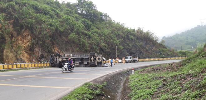 Lái xe tải thoát nạn nhờ hộ lan con lăn trên dốc Cun, Hòa Bình