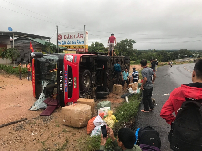 Khi xe vừa chạy qua cầu 110, huyện Ea Hleo thì tài xế đánh tay lái để tránh một xe tải lưu thông theo chiều ngược lại. Do gặp khúc cua gấp, tài xế không làm chủ được tay lái nên xe lao vào lề đường bên phải rồi lật nghiêng.