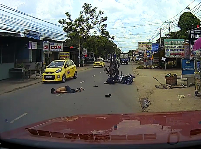 Sau cú va chạm với taxi, cả hai đều bị ngã văng ra đường, người nhẹ thì mài đường còn bạn của anh ta còn bị chiếc xe máy do 2 người thanh niên đi chiều ngược lại cán qua.