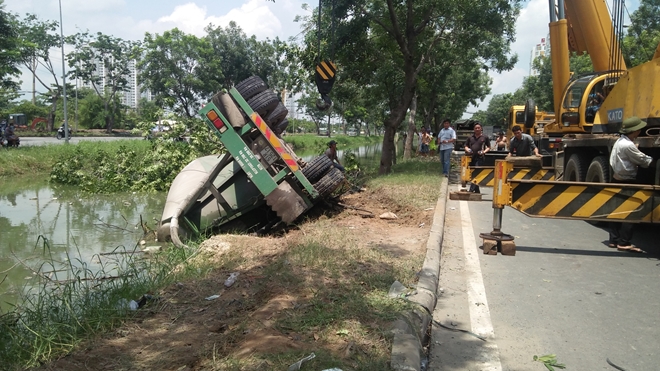 Tài xế xe đầu kéo cho hay, trong lúc điều khiển xe do ngủ gật nên gây ra vụ tai nạn trên. Đến 12h cùng ngày, 2 xe cẩu được điều động đến hiện trường đưa chiếc xe gặp nạn lên bờ.