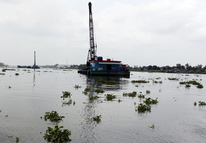 Phương tiện sà lan neo đậu cập mạng phía bên trái xáng cạp. Xáng cạp đâu theo hướng từ An Phú về Châu Đốc. Mũi sà lan hướng về huyện An Phú, đuôi sà lan hướng về Châu Đốc để lấy cát.