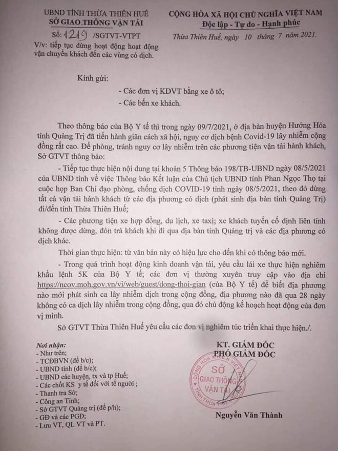 Ngày 10/7 Sở GTVT tỉnh Thừa Thiên Huế ra văn bản số 1219/SGTVT-VTPT về việc tiếp tục dừng hoạt động vận chuyển khách đến các vùng có dịch. Trong công văn nói trên, Sở GTVT tỉnh Thừa Thiên Huế cho rằng: “Theo thông báo của Bộ Y tế, trong ngày 9/7 ở huyện Hướng Hóa (tỉnh Quảng Trị) giãn cách xã hội, nguy cơ dịch bệnh COVID-19 lây nhiễm cộng đồng rất cao”.