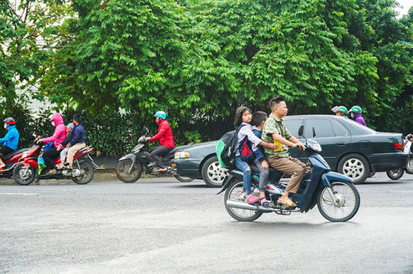| Tình trạng phụ huynh không nhắc nhở con em đội mũ bảo hiểm diễn ra phổ biến. |