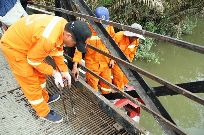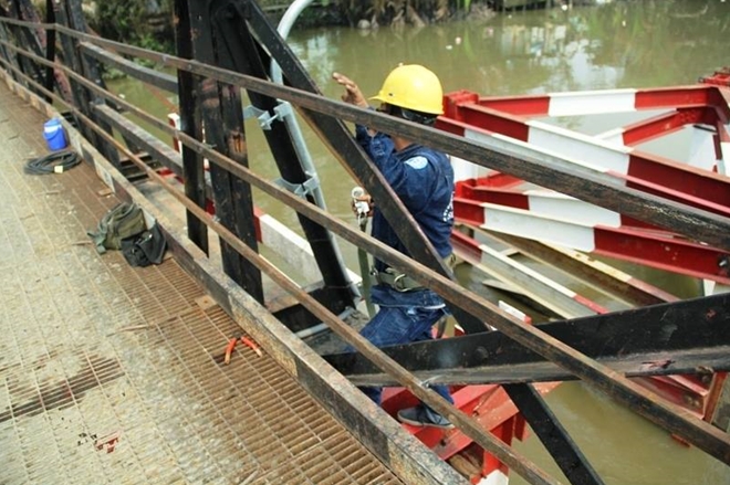 Để đảm bảo an toàn cho cây cầu, Sở GTVT TP đã gắn thanh giới hạn cao 2,2m và biển cấm các loại xe có tải trọng trên 3,5 tấn qua cầu. Tại cầu Long Kiển, công nhân đang gấp rút làm những công đoạn cuối cùng, nhân viên điện lực và công nhân cung cấp nước cũng có mặt tại đây để hoàn thành công việc của mình.