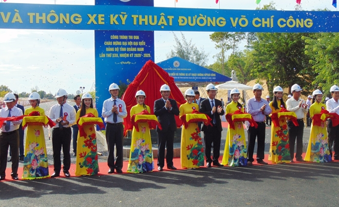 | Lãnh đạo tỉnh Quảng Nam tham gia nghi thức gắn biển đường Võ Chí Công, công trình thi đua chào mừng Đại hội đại biểu Đảng bộ tỉnh lần thứ XXII. |