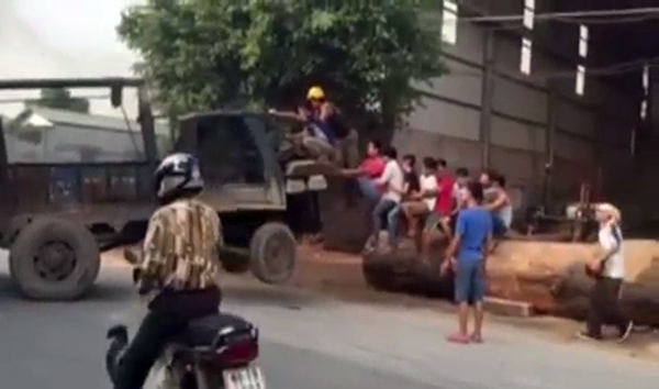 Mười thanh niên được huy động đu bám lên phía đầu xe công nông để cân bằng tải trọng. Cùng với đó, tài xế điều khiển chiếc xe từ từ di chuyển dời khỏi vị trí bị mắc kẹt ban đầu để chuyển khúc gỗ đi nơi khác.