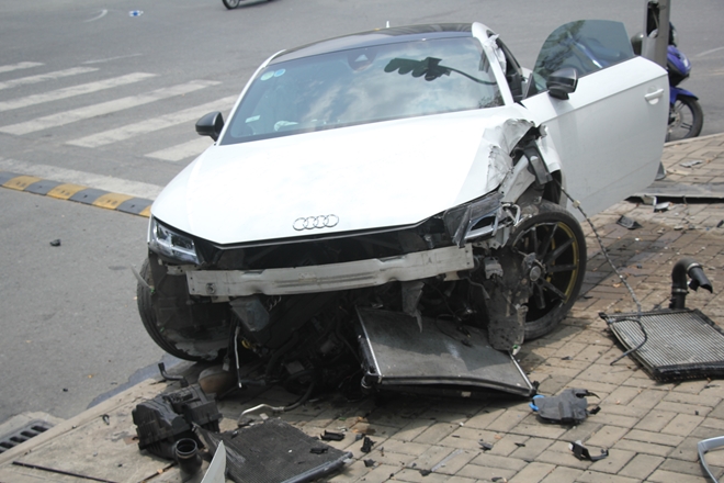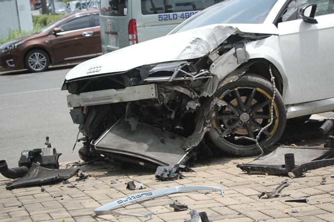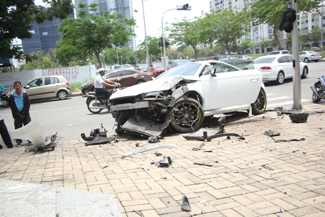 Tại hiện trường đầu chiếc xe Audi trị giá hơn 3 tỷ đồng nát bươm, nhiều mảnh vỡ văng tung tóe, trụ đèn giao thông bị hư hỏng. Theo nhiều người chứng kiến thời điểm xảy ra sự cố xe Audi chạy với tốc độ cao.