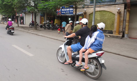 Ghi nhận thực tế trong những ngày cận giờ “G”, PV Báo CAND vẫn chứng kiến hình ảnh nhiều bậc phụ huynh “quên” đội mũ bảo hiểm cho trẻ (từ 6 tuổi trở lên) khi điều khiển xe môtô, xe gắn máy lưu thông trên phố. Tại một số khu vực trước cổng trường vào giờ tan học như: Trường Tiểu học Đ.T, X.L (quận Tây Hồ), Trường Tiểu học H.H.T, B.Đ (quận Ba Đình) v.v… vẫn còn xuất hiện tình trạng bậc phụ huynh chở con em mình trong tình trạng đầu trần.