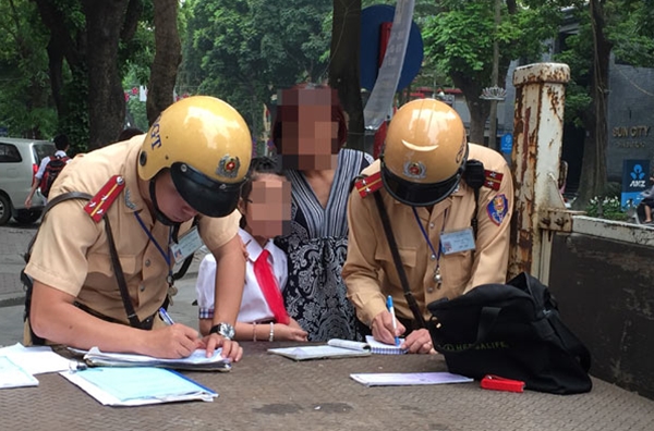 | Cảnh sát giao thông lập biên bản xử phạt phụ huynh chở học sinh không đội mũ bảo hiểm. (Ảnh tư liệu) |