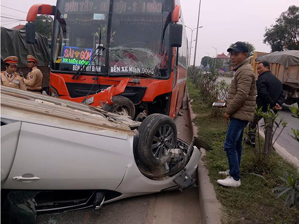 Sau cú tông mạnh của xe khách, chiếc 4 chỗ mất lái, lật ngửa giữa đường, hư hỏng nặng. Xe khách sau va chạm cũng bị hư hỏng ở đầu xe, kính xe vỡ nát. Được biết, trên xe ô tô con vào thời điểm tai nạn có 3 người bao gồm tài xế nhưng rất may chỉ bị thương nhẹ.