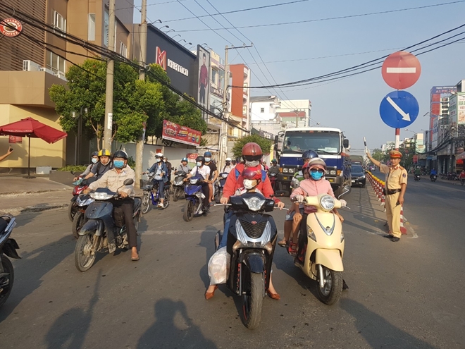 Lực lượng Cảnh sát giao thông điều tiết phương tiện trên đường Mậu Thân.