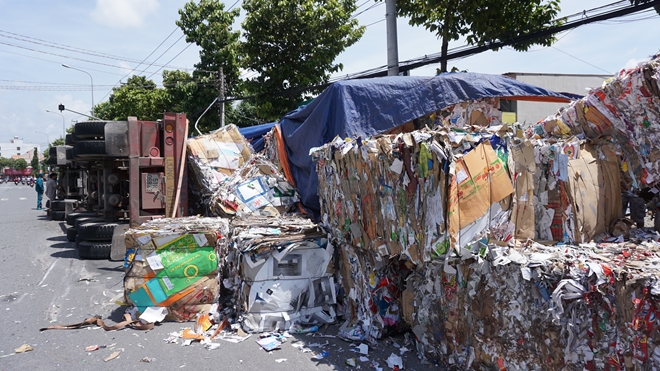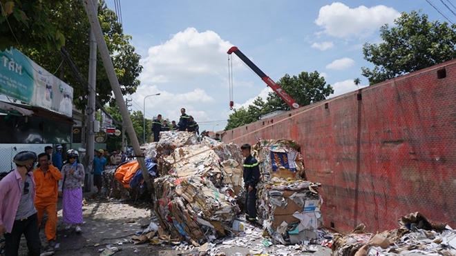 Chưa dừng lại, xe container tiếp tục lao về phía trước một đoạn rồi lật ngang, đè gãy trụ đèn chiếu sáng trên vỉa hè. Các khối giấy nặng hàng chục tấn rơi xuống đường. Rất may thời điểm xảy ra vụ việc không có xe máy lưu thông qua lại nên không gây thiệt hại về người.