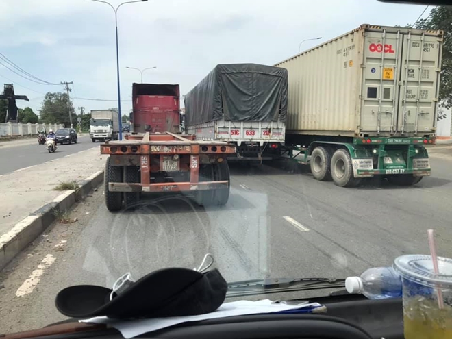 Cảnh xe tải và container vượt và ép nhau trên đường rấ nguy hiểm