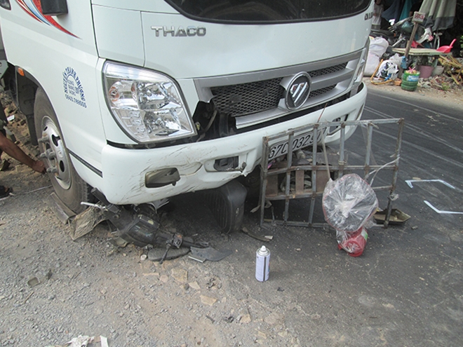 Tại hiện trường, xe máy bị nghiền nát dưới gầm xe tải và kéo lê đoạn đường dài 4m.