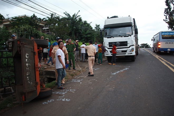 Cú tông bất ngờ đã khiến đầu xe công nông bị lật úp xuống một mương nước ven đường, còn móc kéo nằm lật nghiêng bên vệ đường. Theo tài xế Y Liêm Niê cho biết, vào thời điểm xảy ra tai nạn, trên xe công nông có tất cả 8 em học sinh cùng một số dụng cụ múa lân.