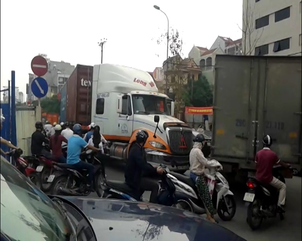 | Chiếc xe container ngang ngược đi vào đường cấm gây ùn tắc trong giờ cao điểm. |