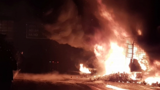 Xe container đang lưu thông trên cao tốc Hà Nội - Lào Cai bỗng nhiên bốc cháy