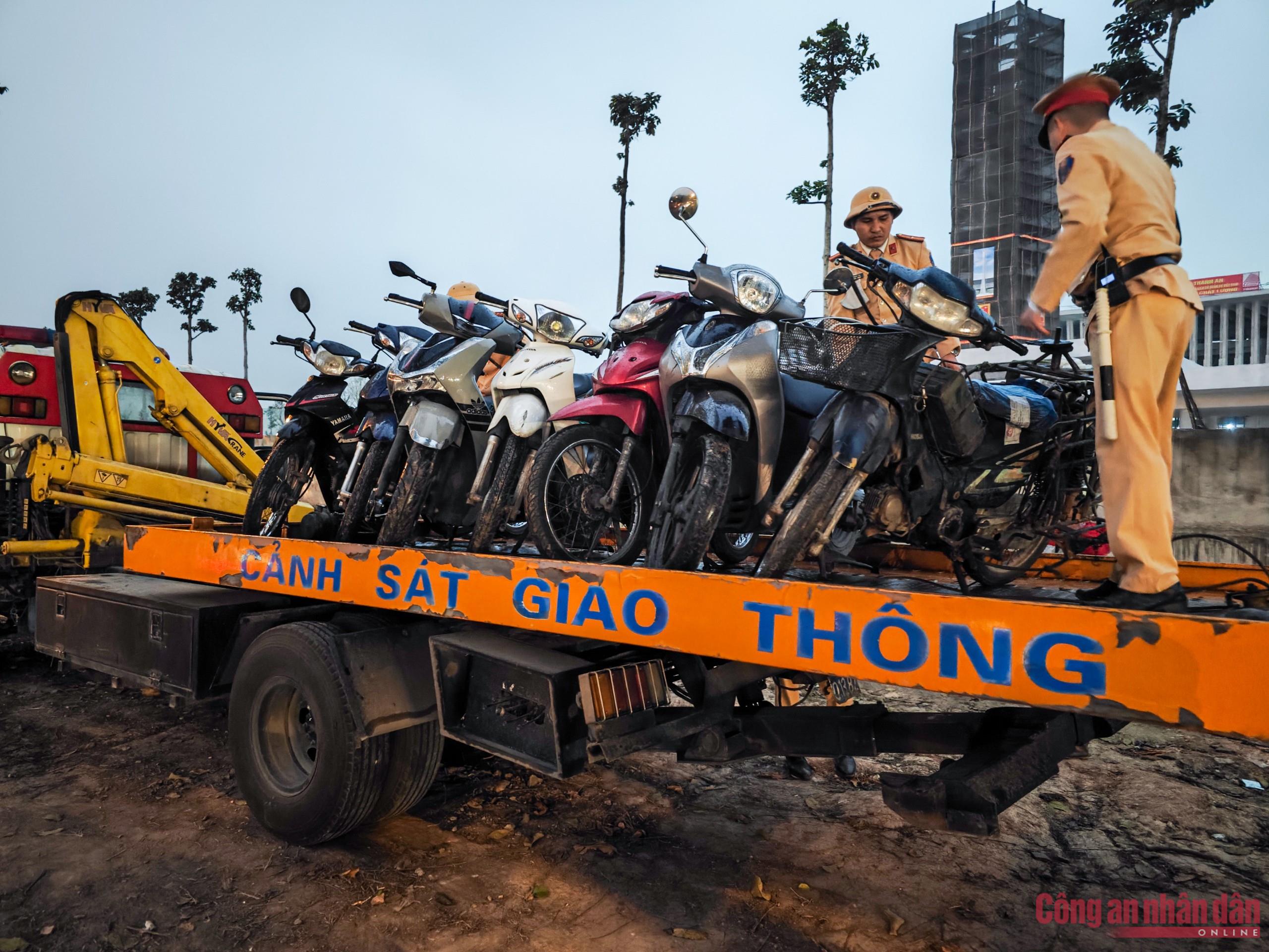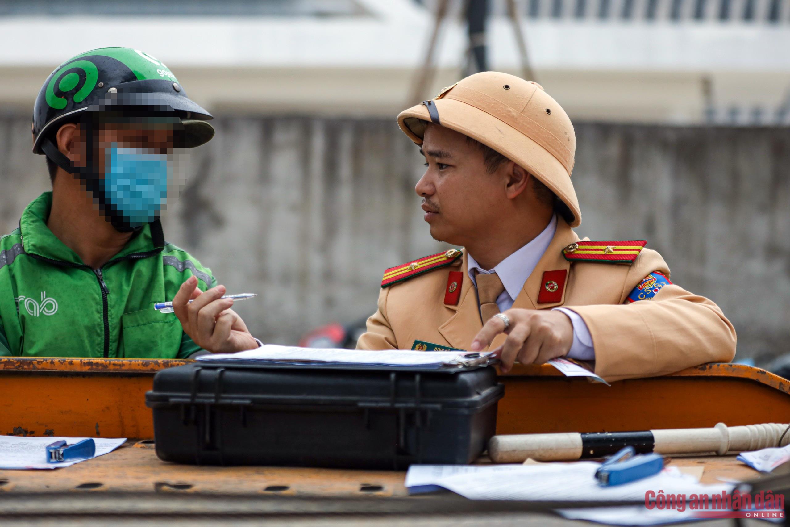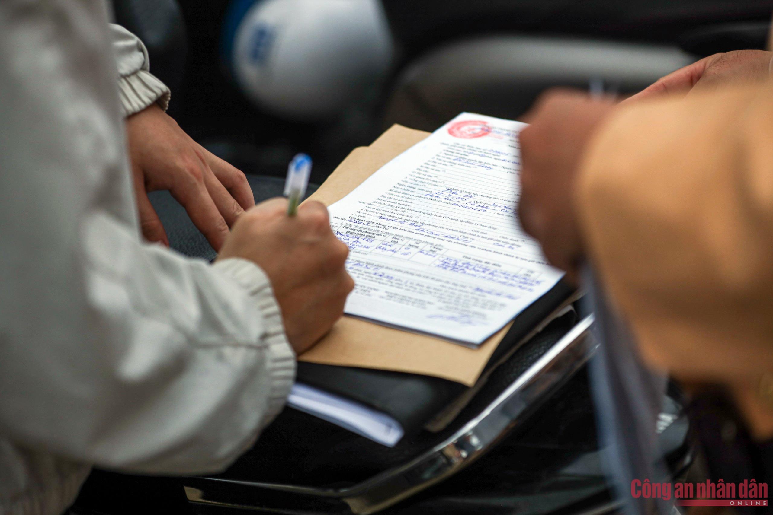 Cảnh sát dừng xử lý tài xế Trần Đ.Nhiều tài xế xe máy nối đuôi nhau di chuyển vào chốt CSGT làm việc.Cán bộ CSGT liên tục lập biên bản xử lý tài xế xe máy đi vào cao tốc với mức phạt 2,5 triệu đồng, tước giấy phép lái xe 4 tháng và tạm giữ phương tiện trong 7 ngày.Nhiều người đi xe máy thấy Cảnh sát lập tức quay đầu phương tiện bất chấp nguy hiểm.Trần Đ. ký vào biên bản xử phạt và niêm phong tạm giữ phương tiện.Tài xế xe ôm công nghệ vừa nhận chuyến chở hàng đi huyện Thạch Thất cho khách nhưng vì cố tình lưu thông vào cao tốc Đại lộ Thăng Long nên bị xử phạt.Người vi phạm ký vào biên bản.Xe chuyên dụng của CSGT được xếp chật xe máy của người vi phạm.