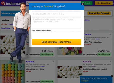 Mọi thứ thượng vàng hạ cám đều có trên IndiaMart - trang thương mại điện tử lớn thứ 2 trên thế giới của Ấn Độ. Tuy nhiên, những người kinh doanh trên IndiaMart thường xuyên quảng cáo hàng loạt sản phẩm bất hợp pháp như là những chất ma túy tổng hợp methamphetamine, ecstasy và LSD v.v…