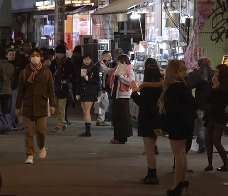 | Những nữ sinh phát tờ rơi quảng cáo JK trên đường phố Tokyo về đêm. |