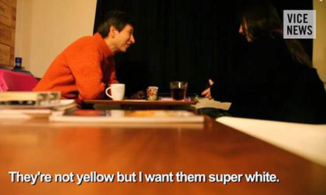 | Camera bí mật của nhóm Vice News quay phim một người đàn ông trò chuyện với nữ sinh trong một quán cà phê. |