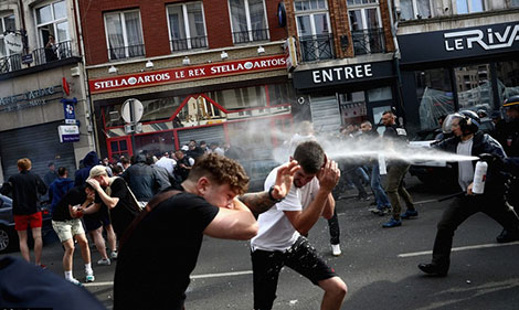 | Cảnh sát Pháp dùng hơi cay và dùi cui nhằm trấn áp các cổ động viên quá khích của đội tuyển Nga. |