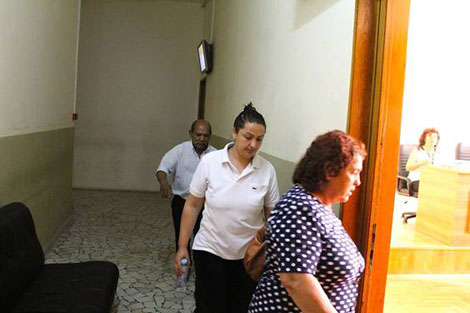 | Bên trong tòa án địa phương ở Burgas: Silvia Dinkova (giữa) với người chồng Racho Dinkov và người láng giềng Stanka Raycheva. Cả 3 người bị buộc tội buôn trẻ sơ sinh. |