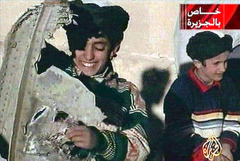 | Hamza Laden và mảnh vỡ chiếc máy bay bị al-Qaeda bắn hạ. |