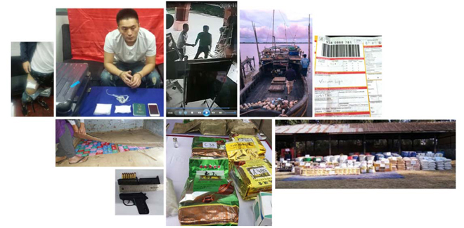 Vụ bắt giữ Cai Jeng Ze (hàng trên, bên trái) tại sân bay Yangon (Myanmar) với 2 túi chứa ma túy đá dán vào hai đùi, đã dẫn đến việc tịch thu hàng tấn ma túy và vũ khí.