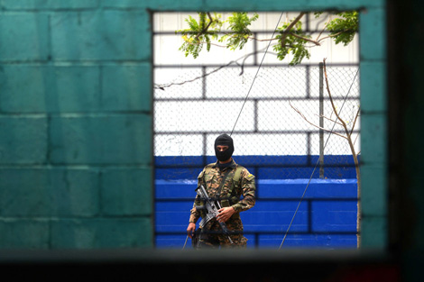 | Một thành viên của FES đứng gác tại thành phố Soyapango (nơi nổi tiếng là thành trì của MS-13) nằm cách thủ đô San Salvador của El Salvador chừng 6km về phía đông, tháng 4-2016. |