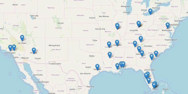Bản đồ của FBI về các địa điểm xảy ra 50 vụ án mà Samuel Little đã thú nhận. Ảnh:  OpenStreetMaps/FBI.