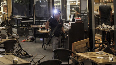 | Nhân viên an ninh Israel kiểm tra tại hiện trường vụ nổ súng tối 10-6. |