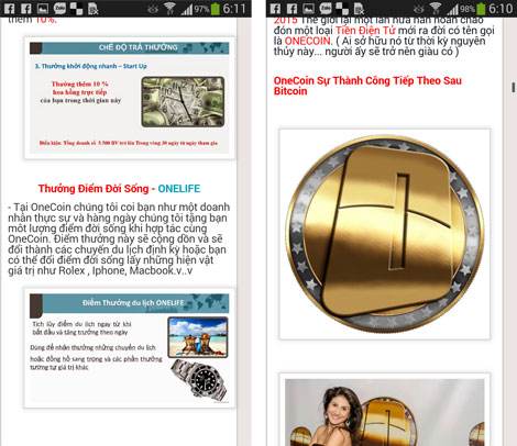 Ngoài ra, các diễn đàn này còn quảng cáo rằng nhà đầu tư Onecoin còn được trả thưởng bằng các chuyến du lịch định kỳ hoặc đổi điểm thưởng bằng những hiện vật giá trị như đồng hồ Rolex, điện thoại Iphone, máy tính Macbook…