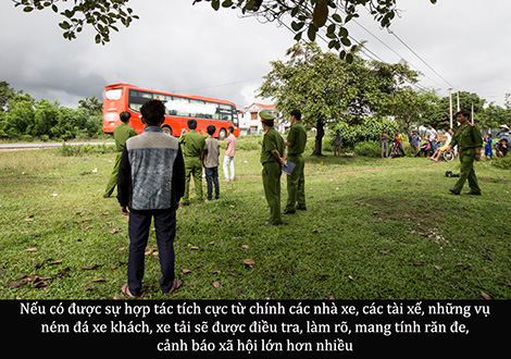 "Ngay cả những hãng xe khách giường nằm trên tuyến đường này cũng bị ném đá thường xuyên. Nhưng nếu có thể khắc phục được, hoặc thiệt hại không đáng kể, đa phần họ thường chọn phương án tự giải quyết. Nếu vào trình báo, làm thủ tục khám nghiệm, khai báo thiệt hại, hành khách sẽ la ó, chủ xe sẽ rầy. Chỉ những vụ nghiêm trọng họ mới buộc phải kêu cứu công an", người lái xe tiết lộ.