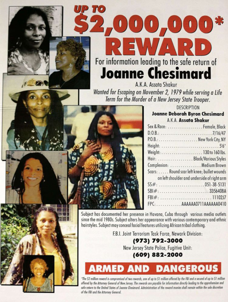 | Poster với hình ảnh của Joanne Chesimard (tức Assata Shakur) được trưng bày trong cuộc họp báo đưa ra thông tin cập nhật về cuộc truy nã Chesimard vào ngày 2-5-2013 tại thành phố Newark, bang New Jersey. |